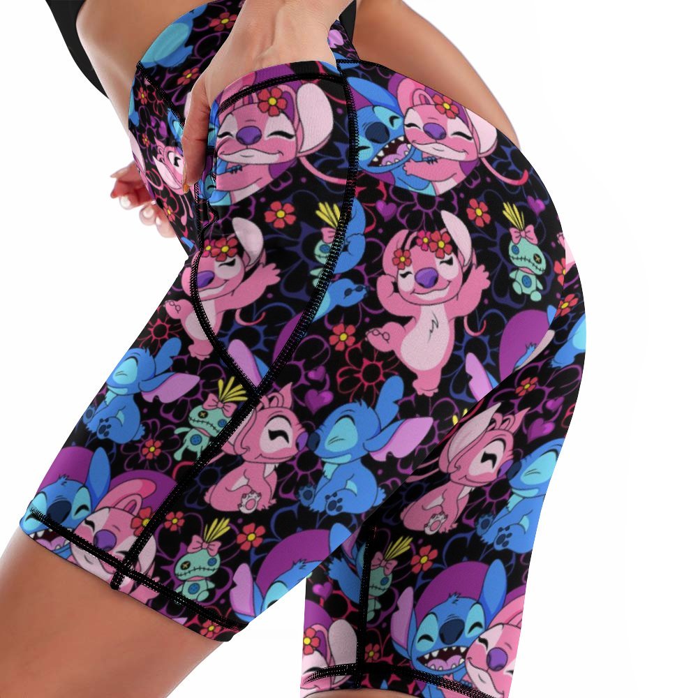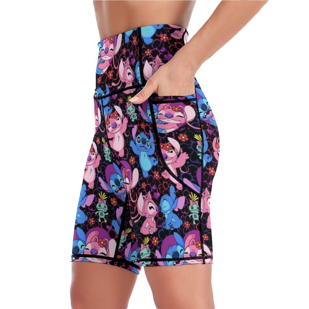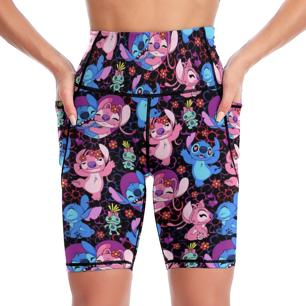 Disney Lilo And Stitch Angel Besties Women's Knee Length Athletic Yoga Shorts With Pockets