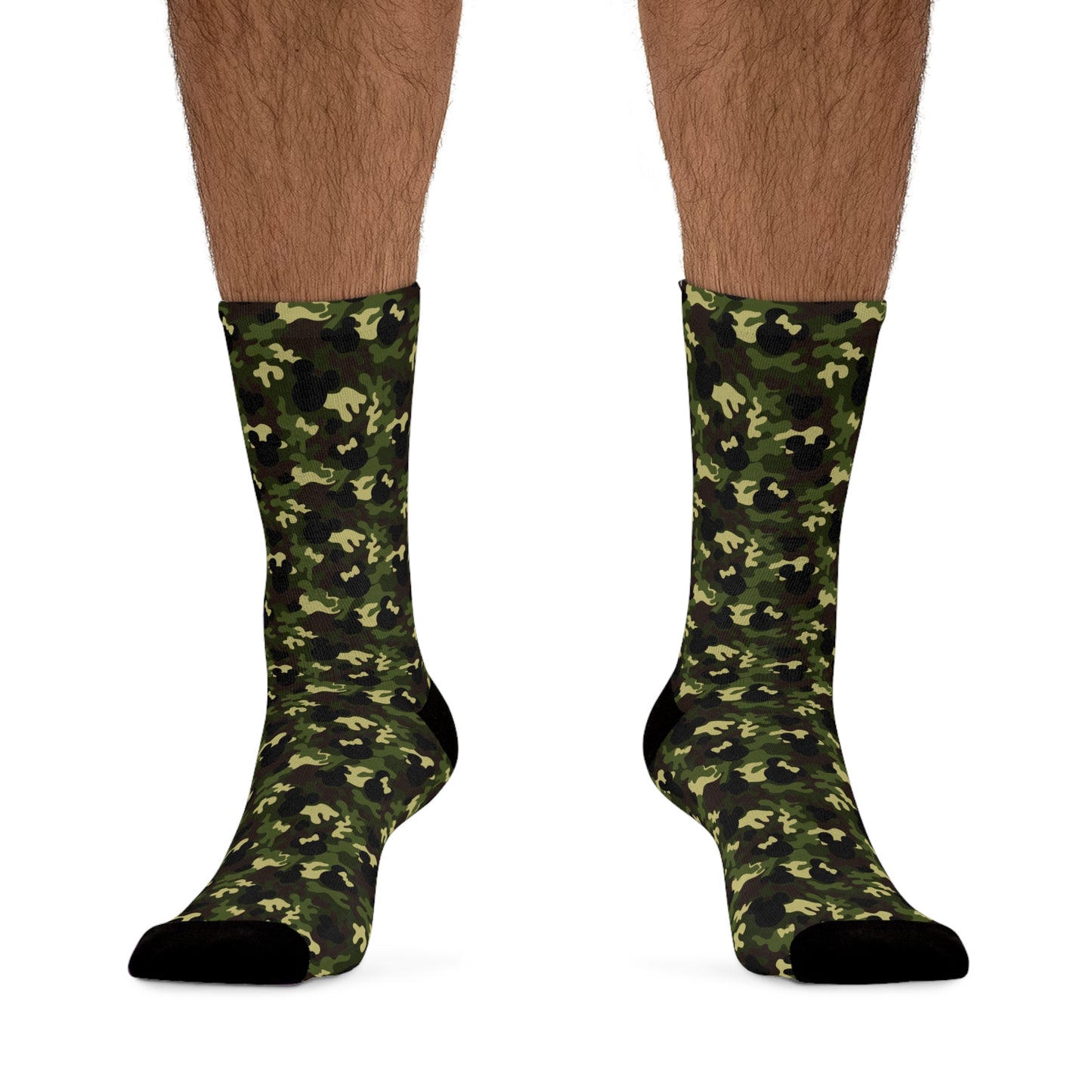 These socks are made using a proprietary blend of yarns. They are 200 needle knit crew made from 58% Recycled Polyester 22% Nylon 15% Cotton and 5% Elastane. They are a true one size fits most, and are available up to size 12 Men's (U.S.). These socks have an unprecedented amount of stretch with durable print quality.