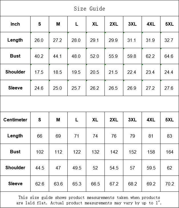 | Inch | S | M | L | XL | 2XL | 3XL | 4XL | 5XL |