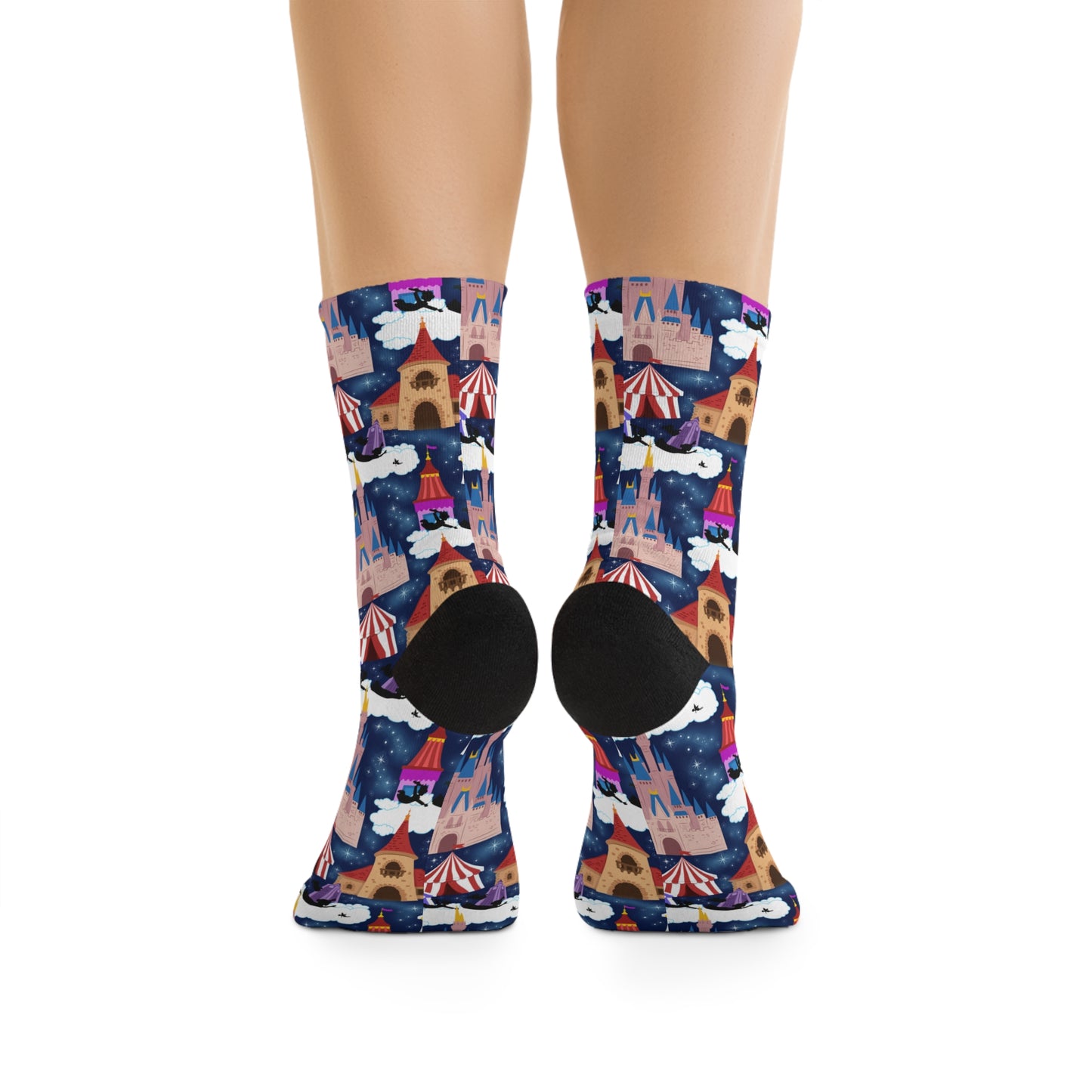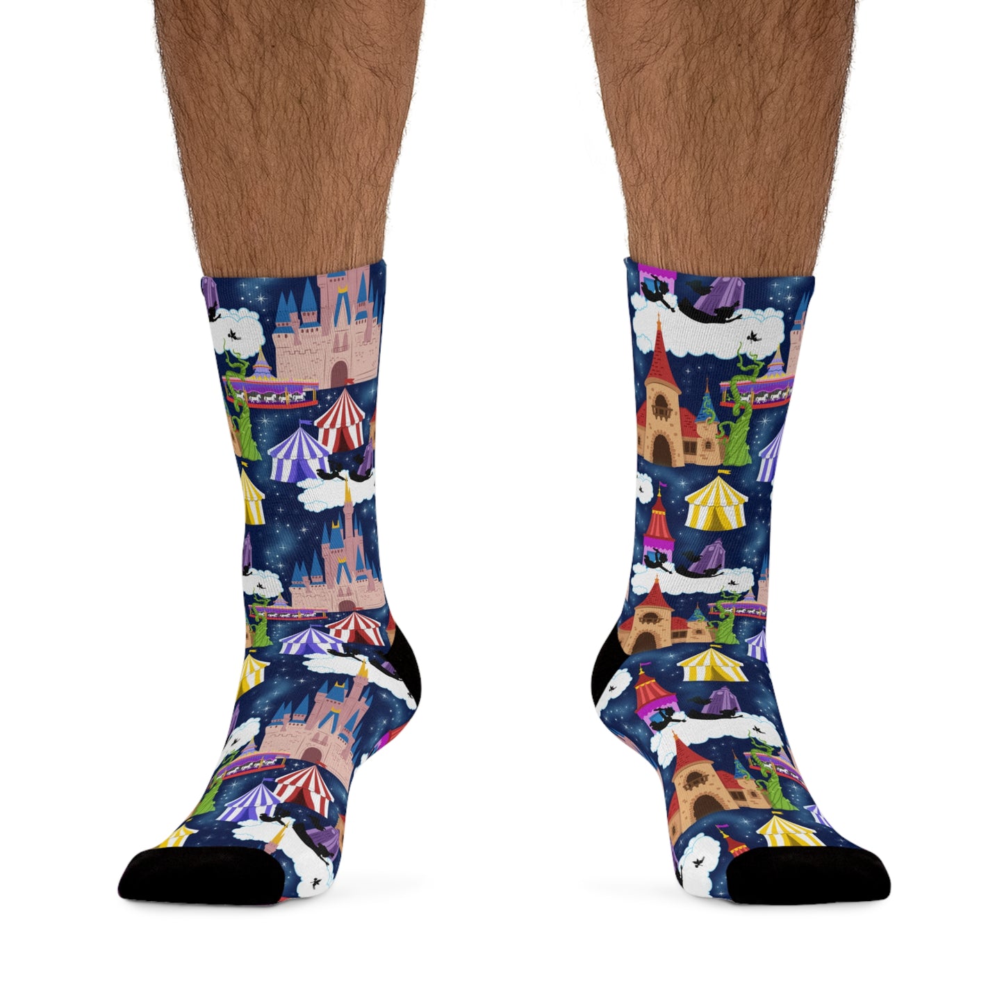 These socks are made using a proprietary blend of yarns. They are 200 needle knit crew made from 58% Recycled Polyester 22% Nylon 15% Cotton and 5% Elastane. They are a true one size fits most, and are available up to size 12 Men's (U.S.). These socks have an unprecedented amount of stretch with durable print quality.