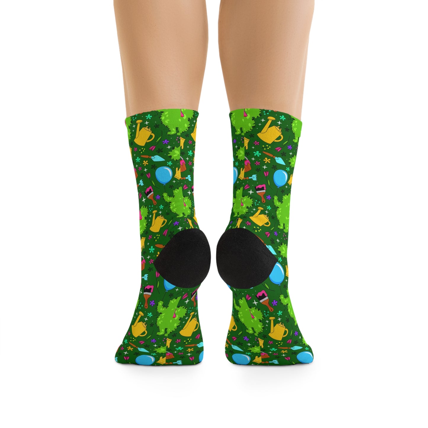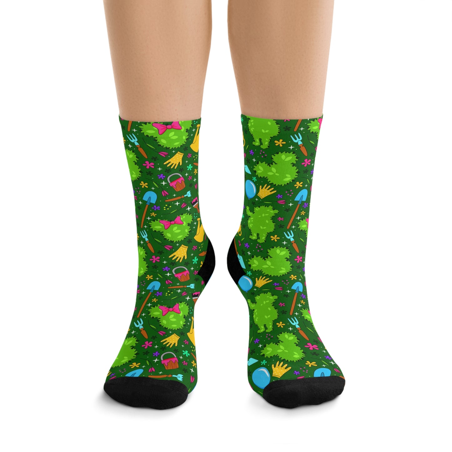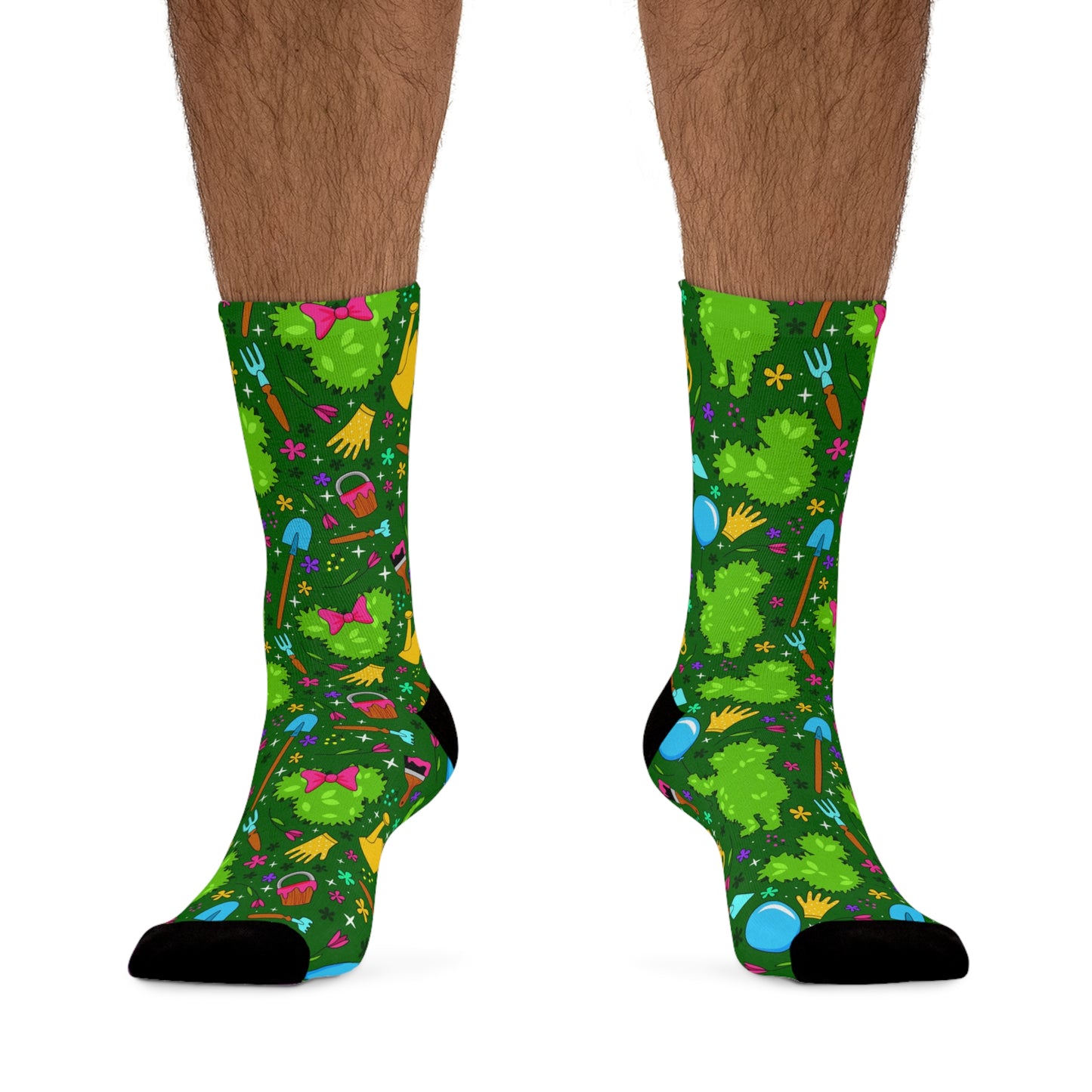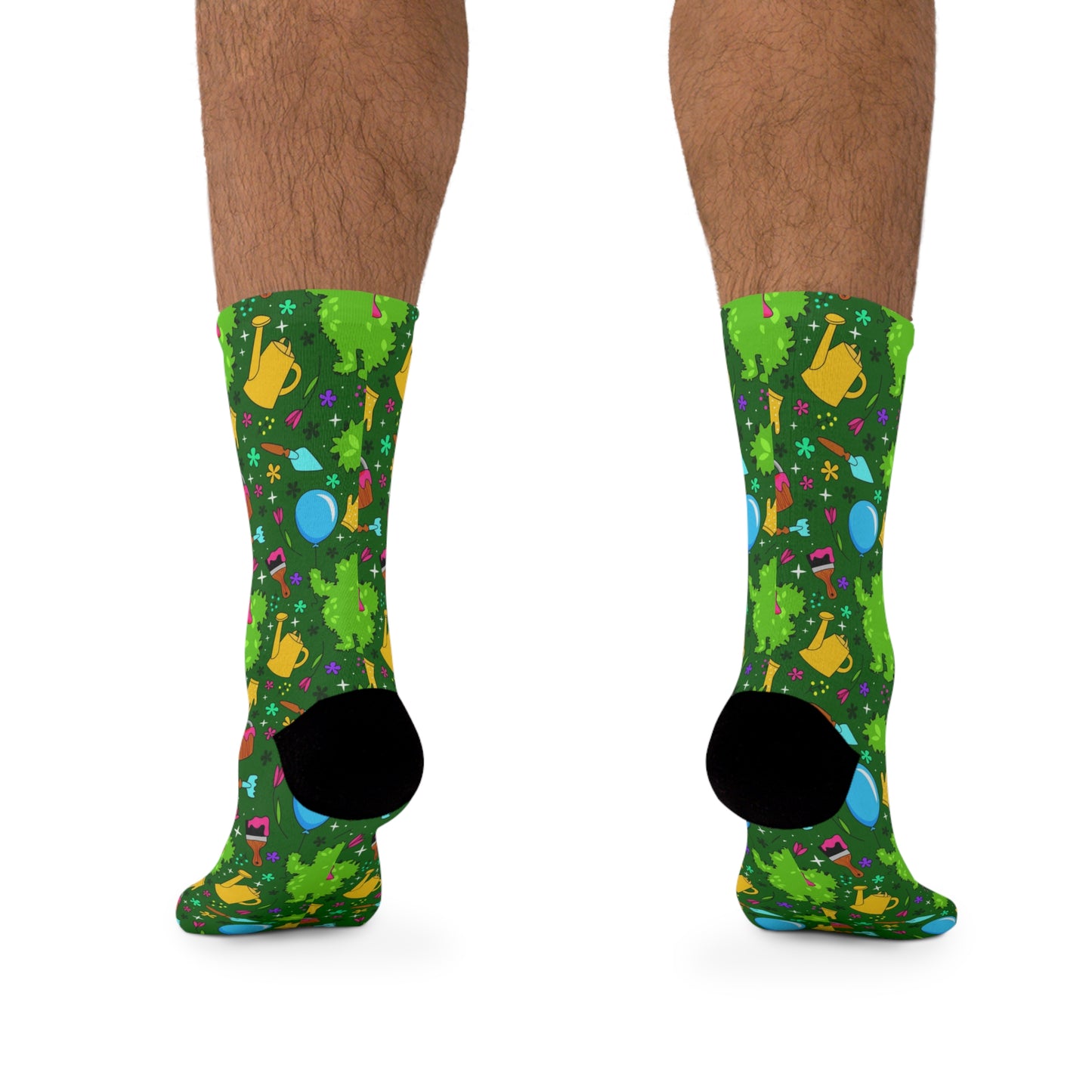 These socks are made using a proprietary blend of yarns. They are 200 needle knit crew made from 58% Recycled Polyester 22% Nylon 15% Cotton and 5% Elastane. They are a true one size fits most, and are available up to size 12 Men's (U.S.). These socks have an unprecedented amount of stretch with durable print quality.
