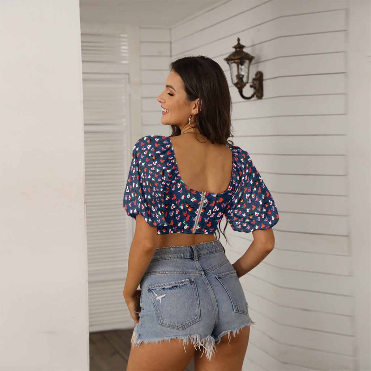 Mickey Flags Women's Square Collar Cropped Top With Puff Sleeve