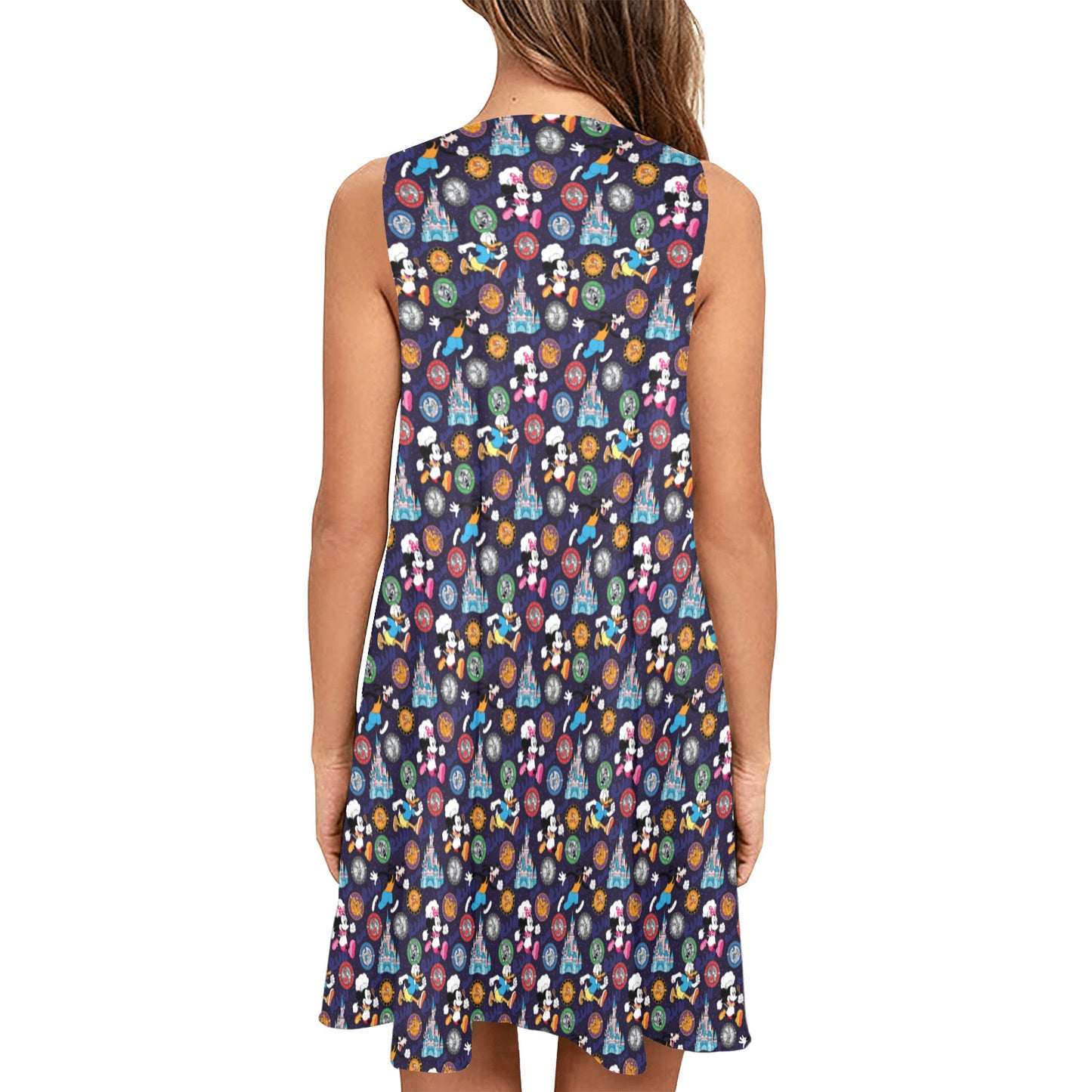 Step into the magical world of Disney with our enchanting Sleeveless A-Line Pocket Dress, designed to add a touch of whimsy and joy to your visit to the Disney parks. This dress is a celebration of all things Disney, combining comfort and style in a design that captures the spirit of your favorite characters and stories.