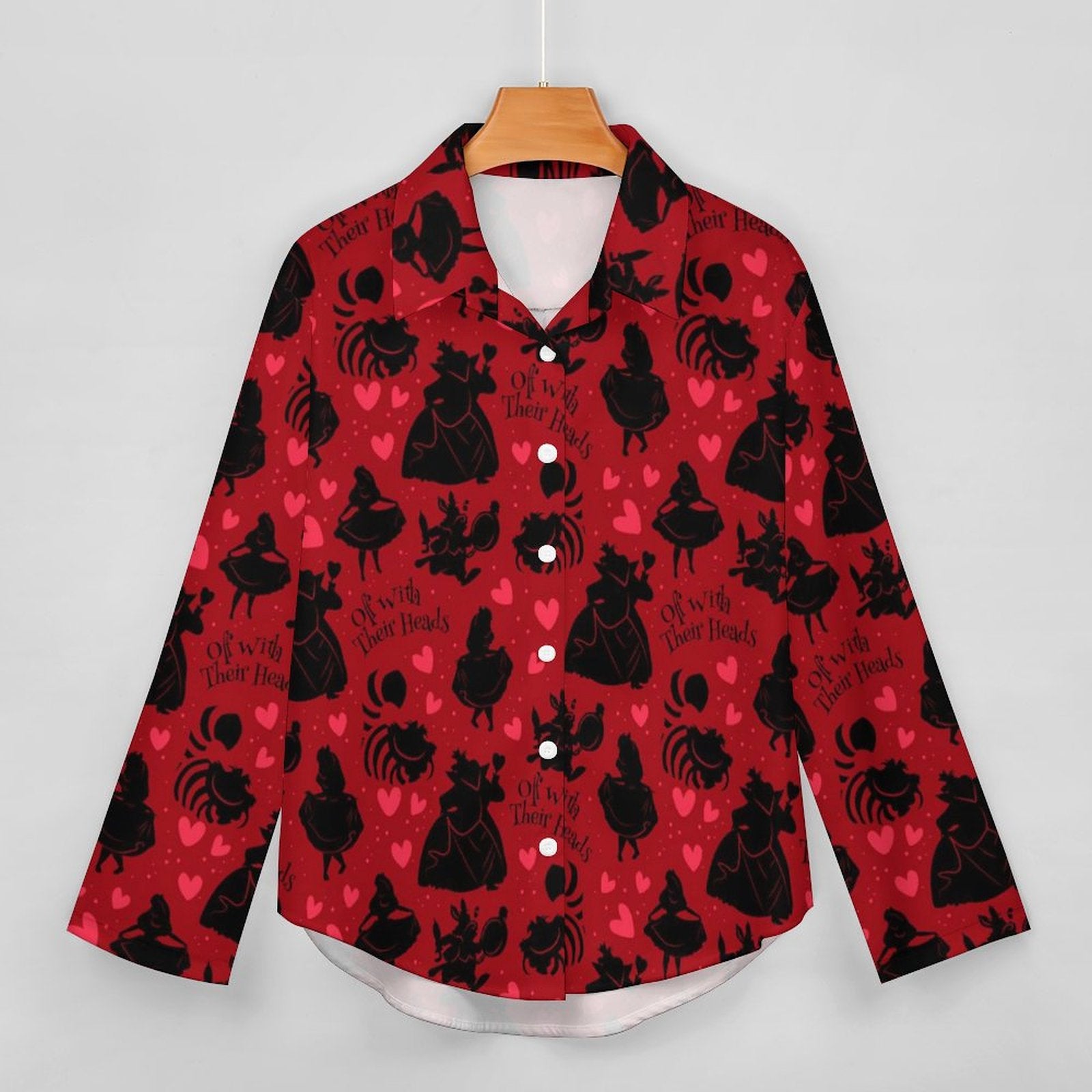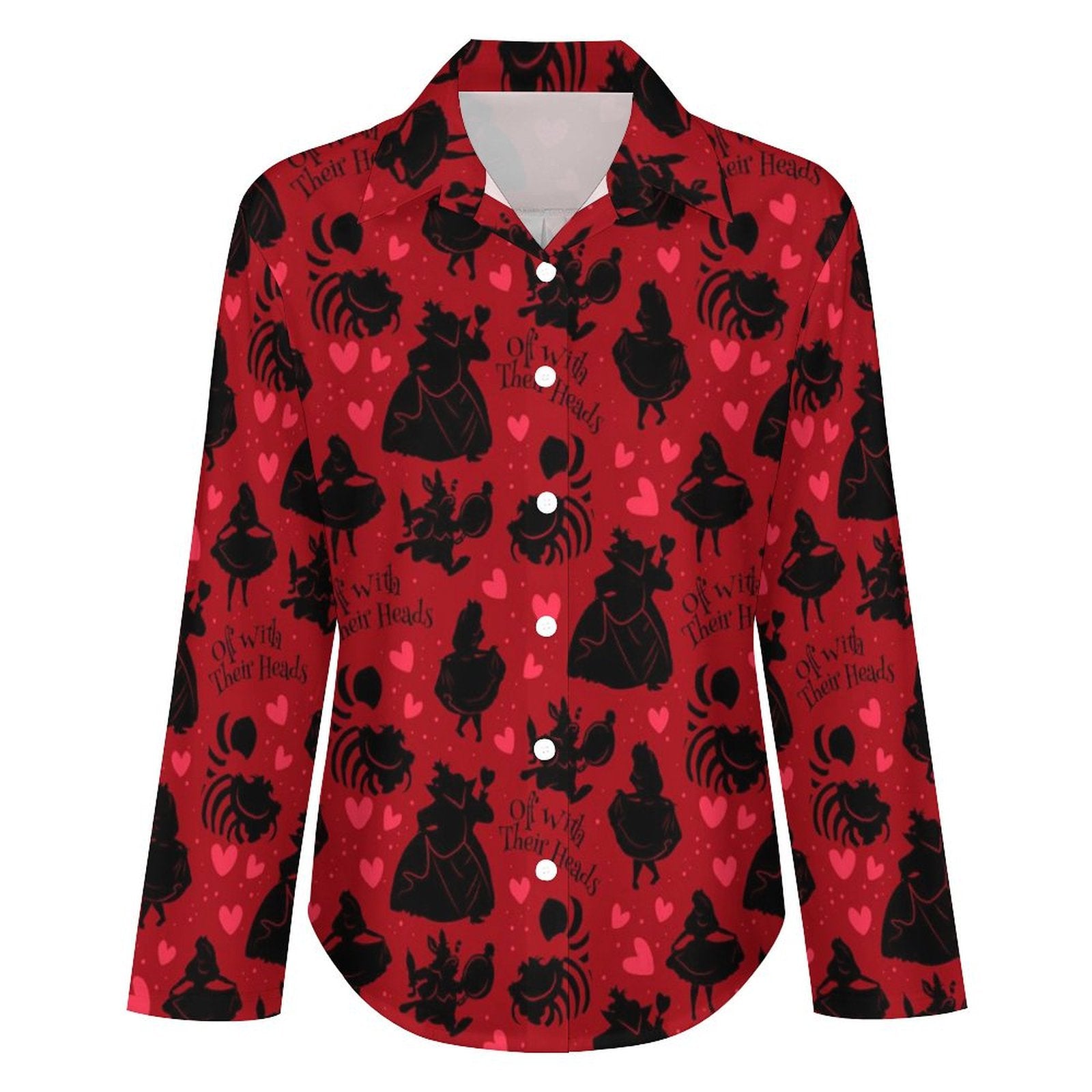 Disney Alice In Wonderland Queen Of Hearts Off With Their Heads Long Sleeve Button Up Blouse