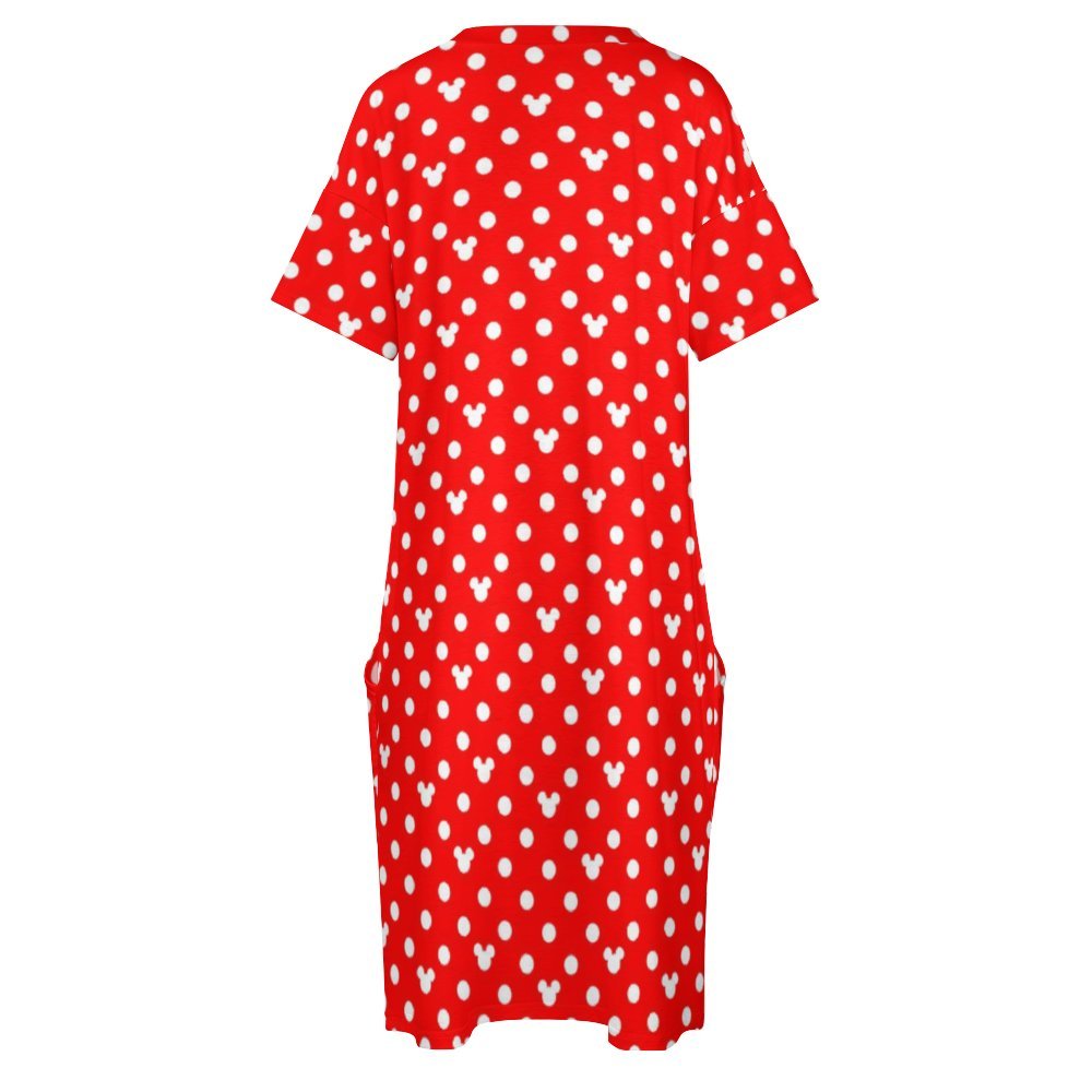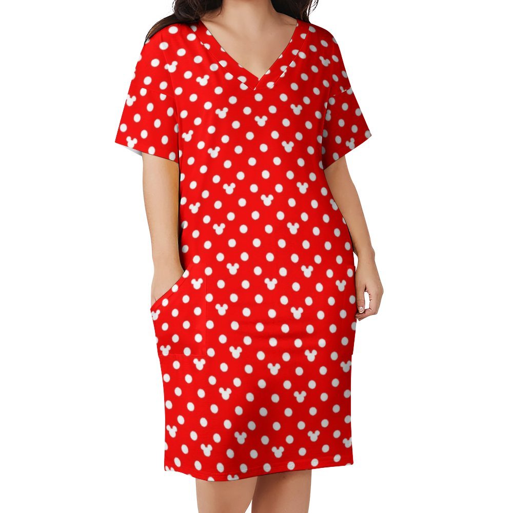 Red With White Mickey Polka Dots Women's V-neck Loose Dress With Pockets