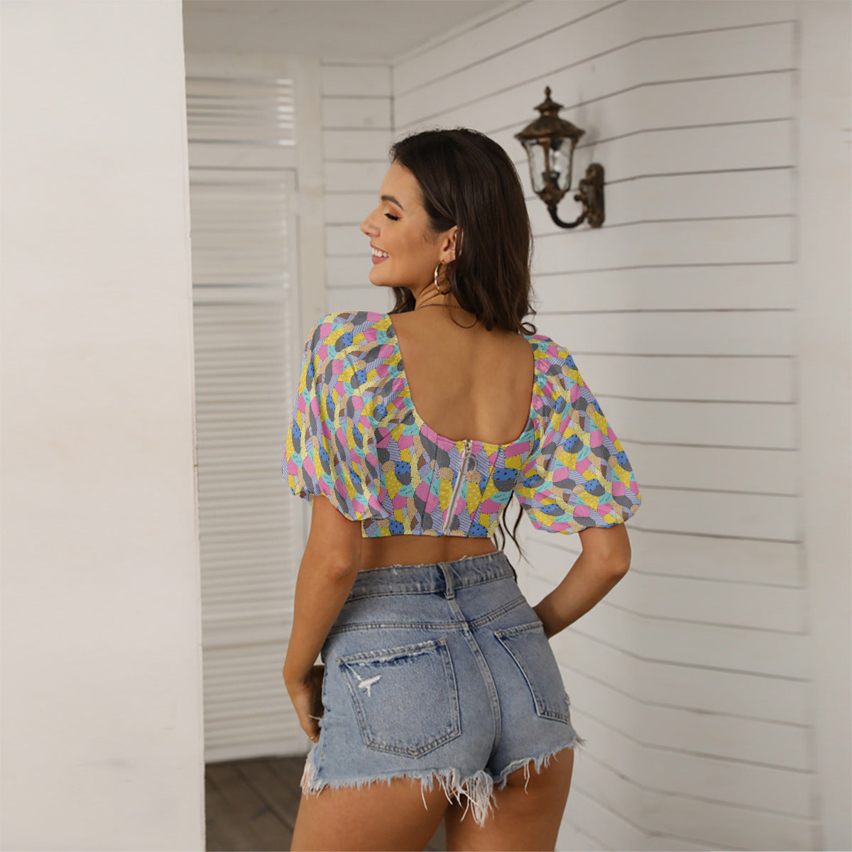 - Cropped top, front lace and back zipper, puff sleeve