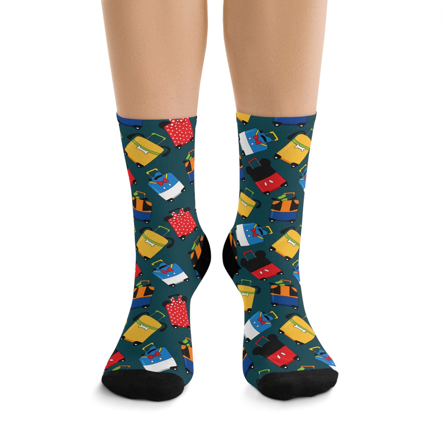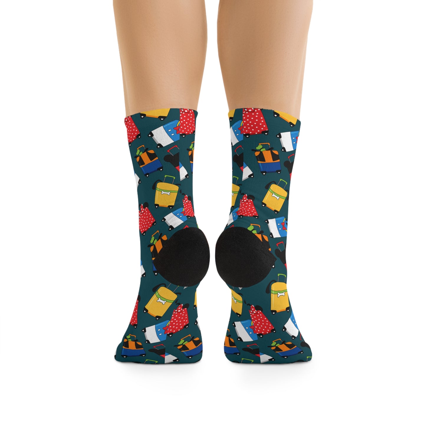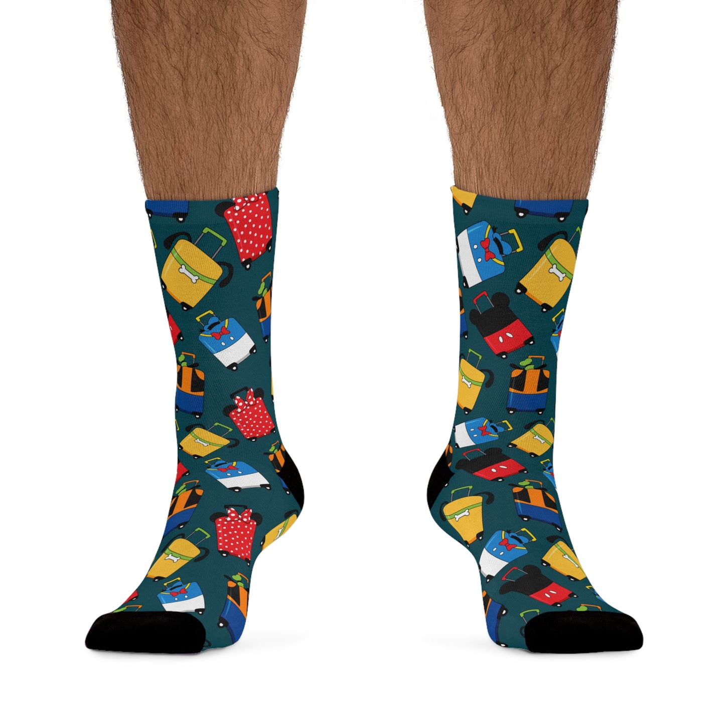 These socks are made using a proprietary blend of yarns. They are 200 needle knit crew made from 58% Recycled Polyester 22% Nylon 15% Cotton and 5% Elastane. They are a true one size fits most, and are available up to size 12 Men's (U.S.). These socks have an unprecedented amount of stretch with durable print quality.